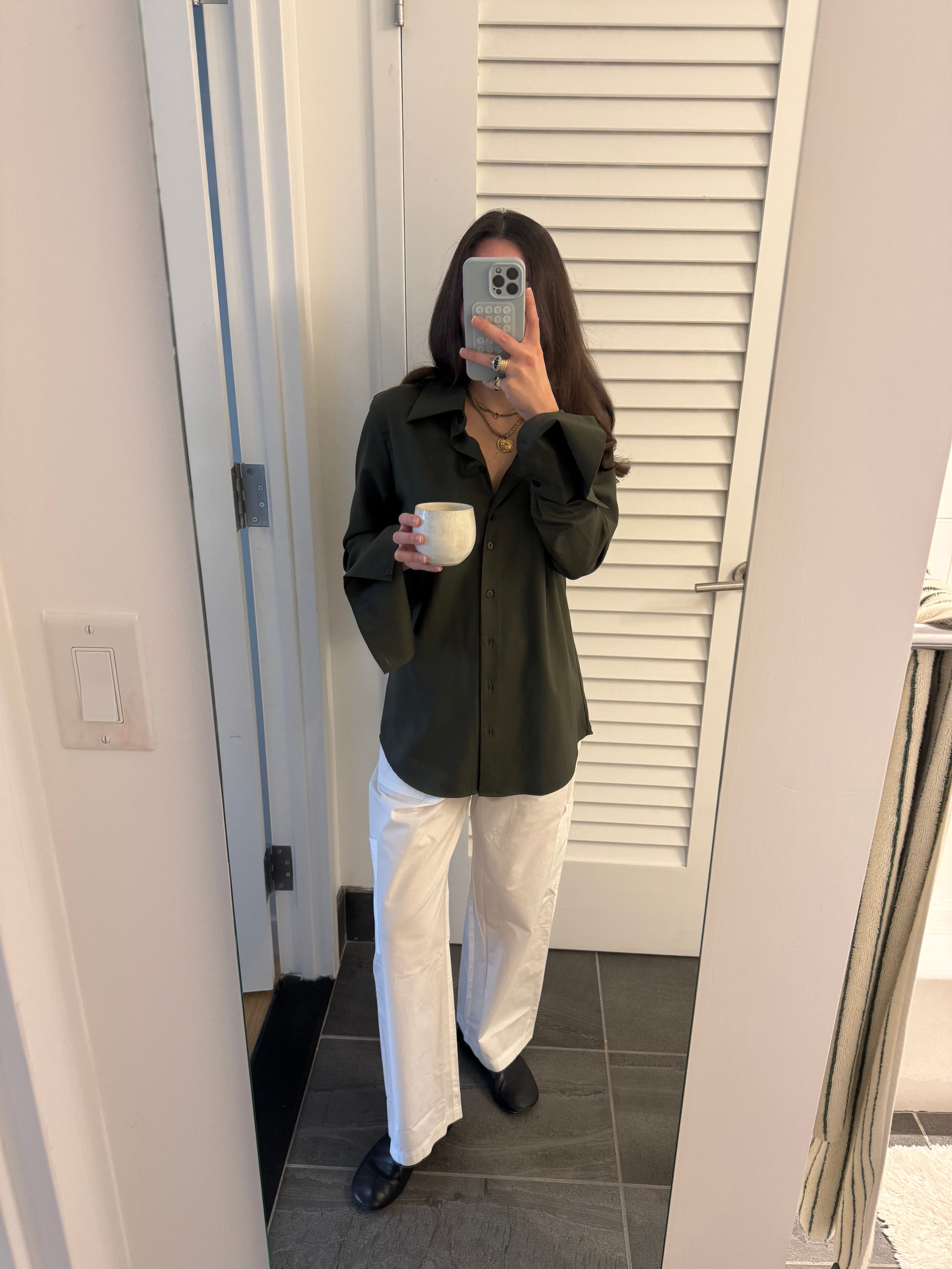 Here is how I wore our Sloan in Thyme wool during a WFH day with my favourite coffee mug in hand
