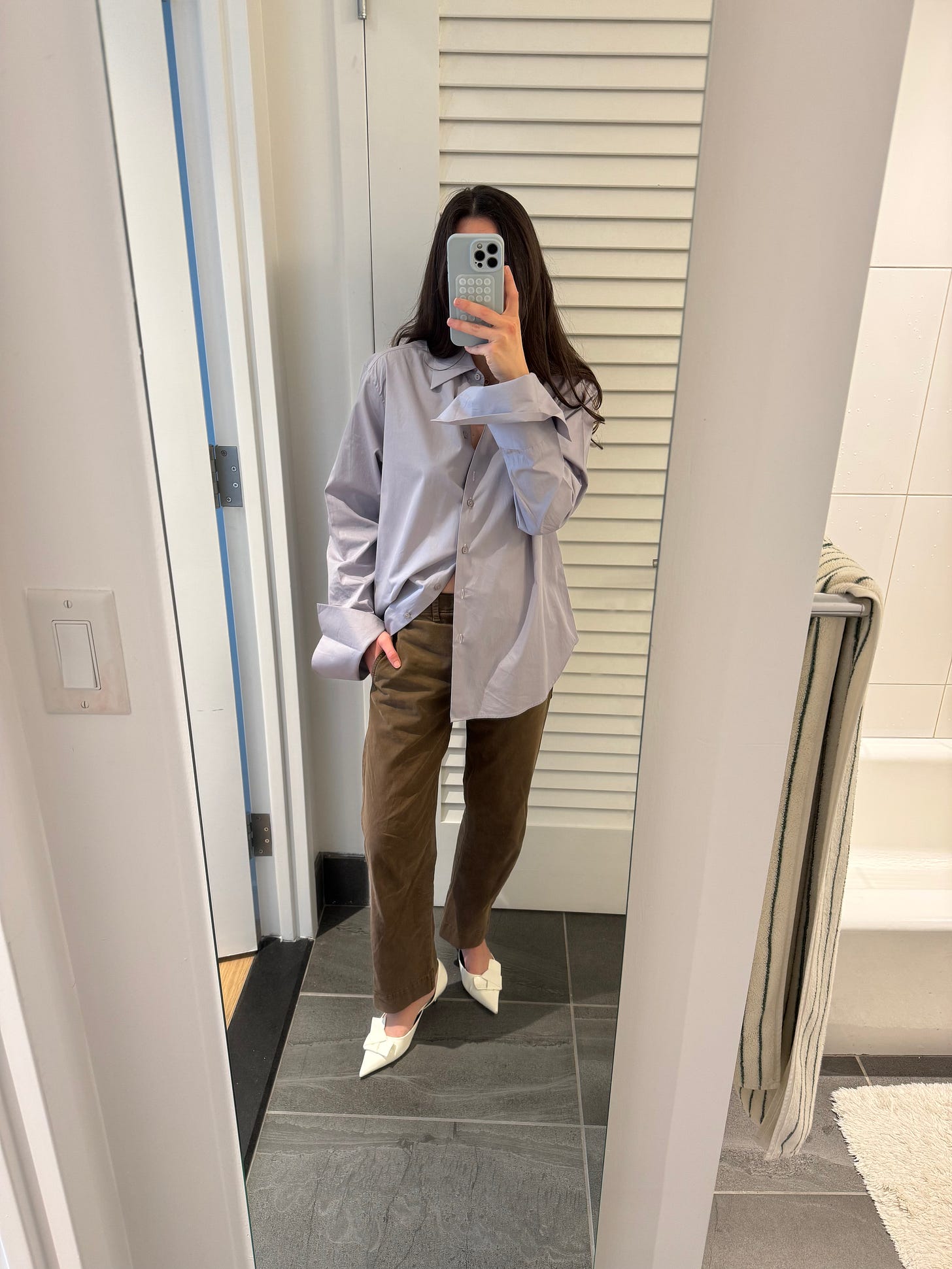 Coffee meetings & WFH — to me here, in this look, the white shoe is actaully the loud pop-of-colour since the purple and browns are living within their dusty counterparts, even though white is also a neutral, its the loudest one of the bunch here.